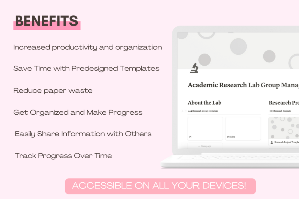 Designed specifically for academic research labs, this all-in-one Notion template helps you manage your research projects, schedule meetings, track orders and deliveries, track tasks, and oversee projects effectively. Transform the way you manage your academic research lab today by investing in this Notion Template!
