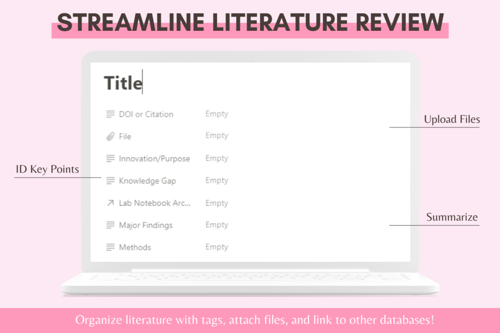 The Research Lab Notebook template includes a master experiment and task tracker, a weekly and daily schedule, a project-based lab notebook, a literature review template, and more! This Notion template helps you streamline your research and stay organized. You can access your notes from anywhere, and you'll never have to worry about losing important research findings again!