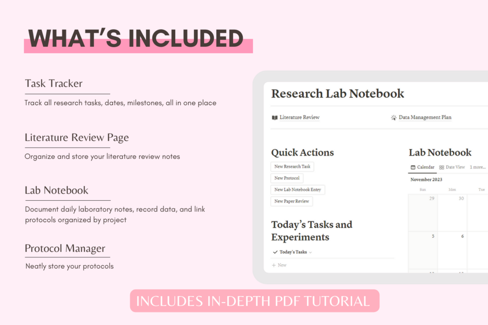 The Notion Research Lab Notebook template includes: